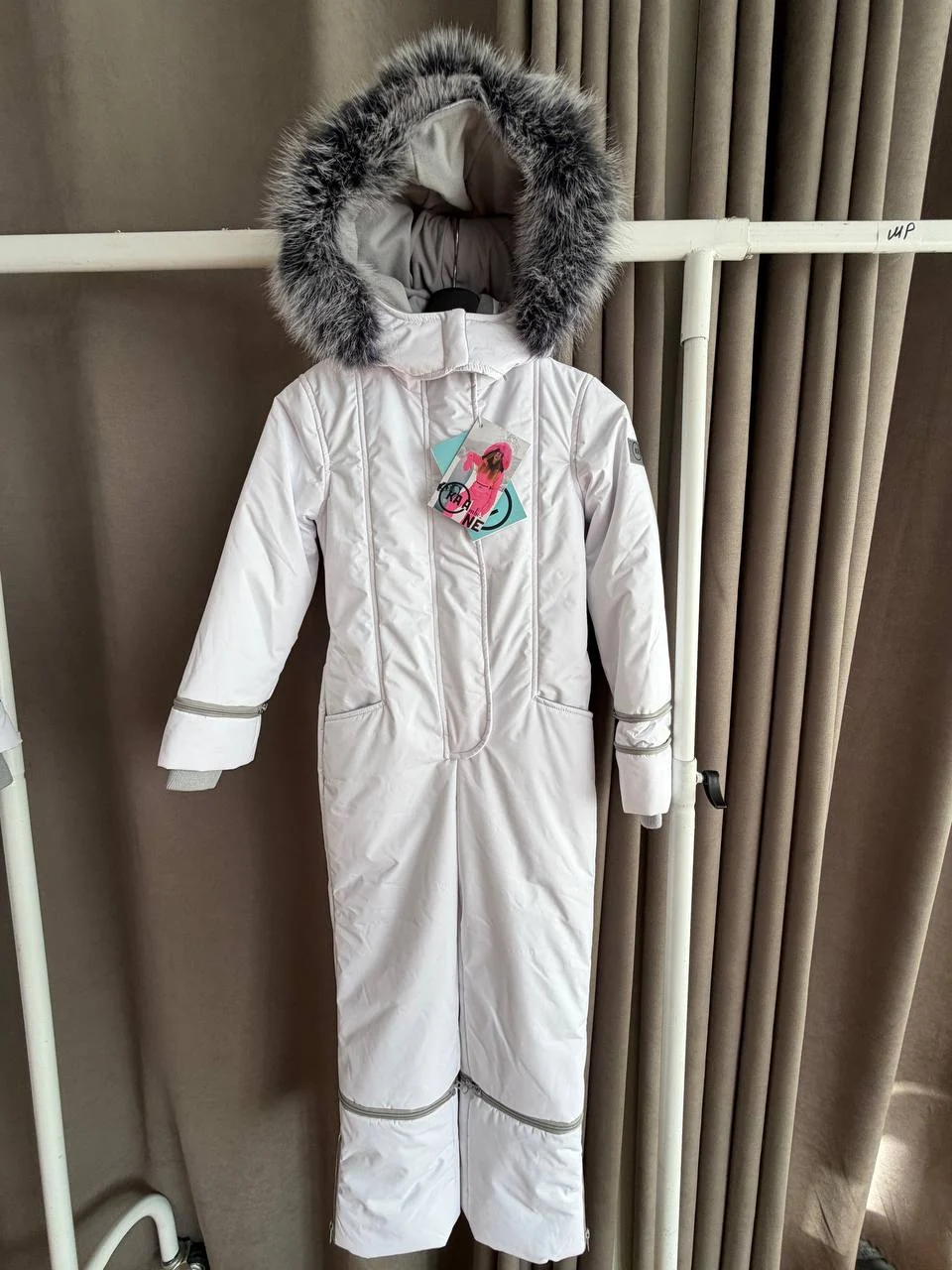 Комбинезон детский Белый, подклад, молнии, манжеты: серый, мех: стандартный сноутоп, подтяжки, светоотрожающий кант, снеговая юбка горнолжная короткая молния.
