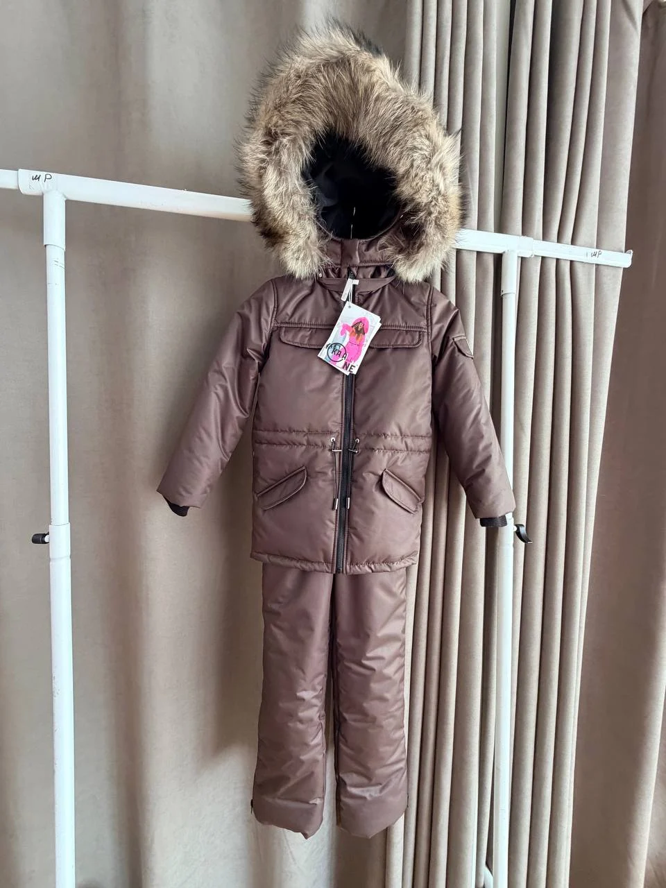 Костюм зимний детский Капучино, подклад, молнии, манжеты: черный, Мех макси енот, скипасс, подтяжки