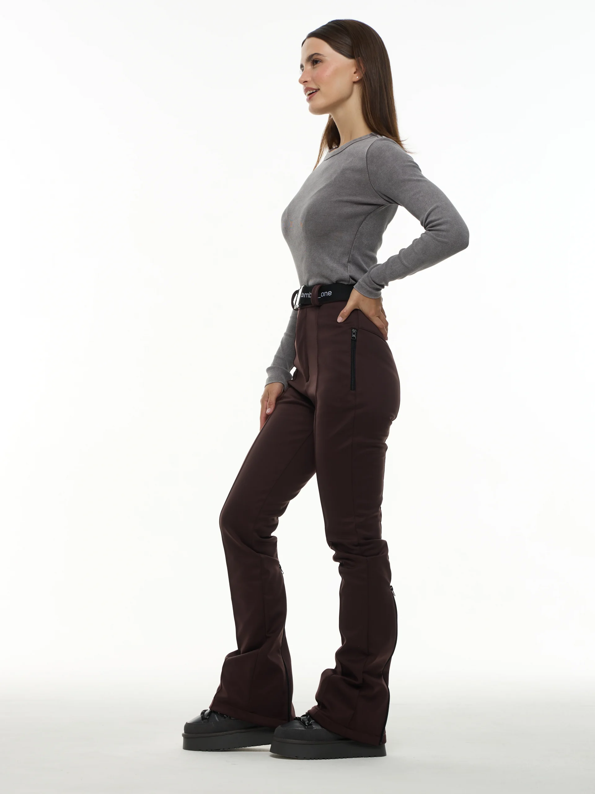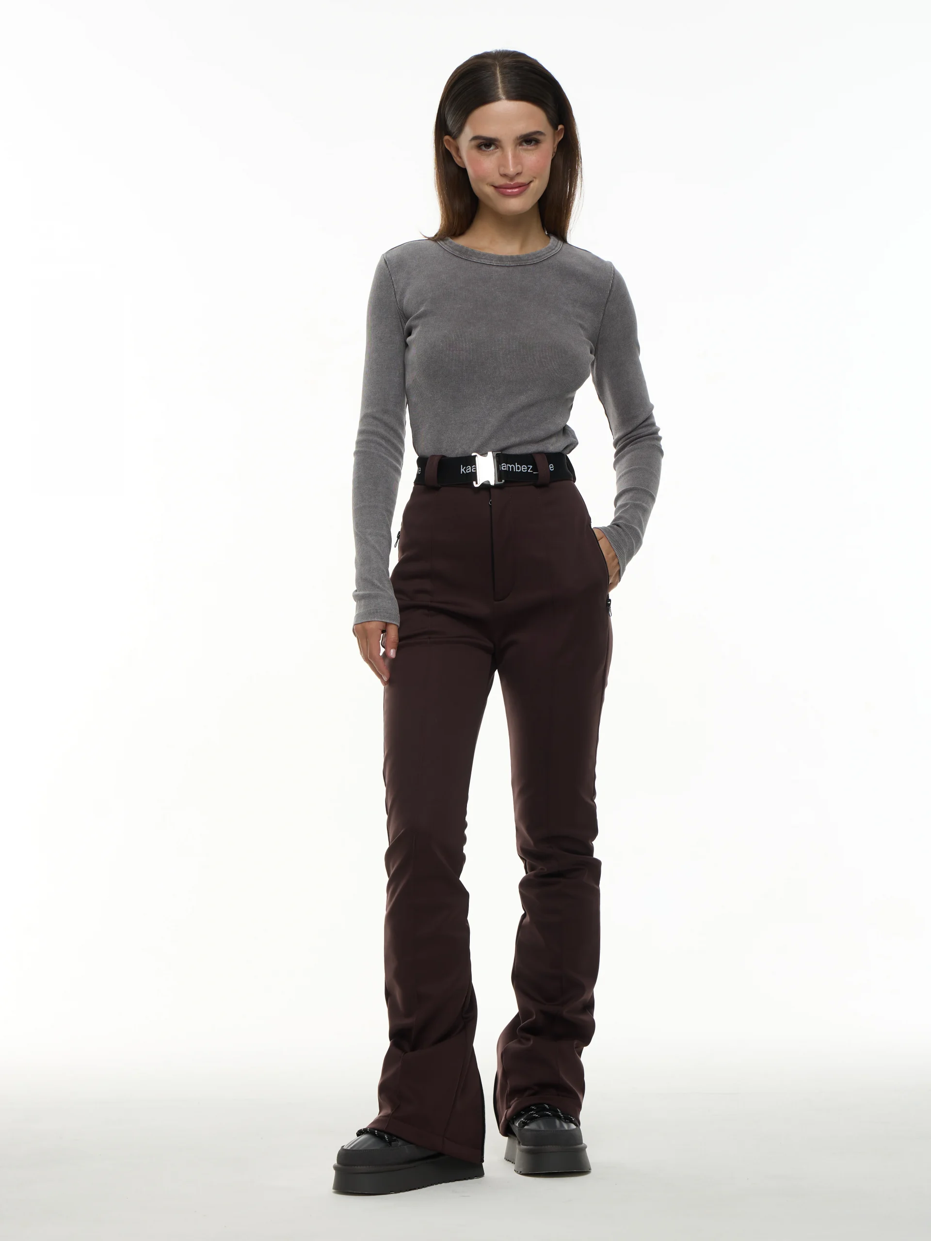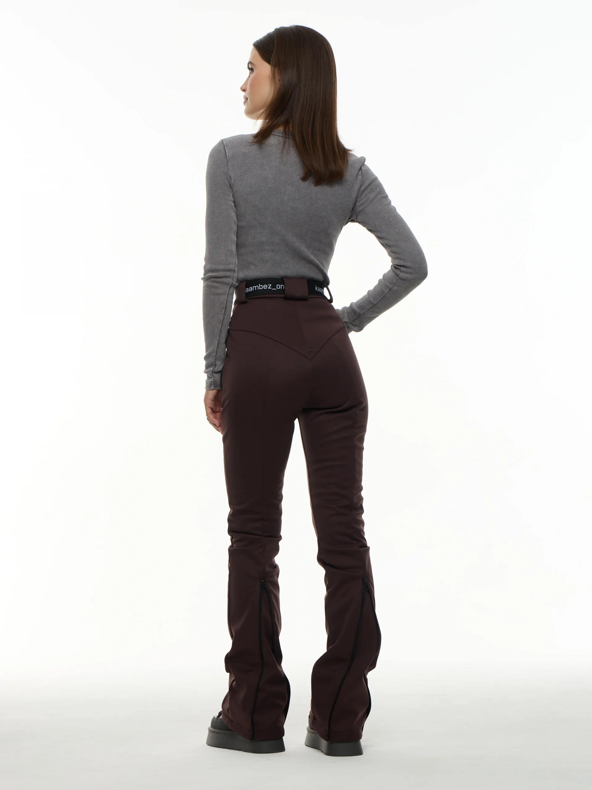 Брюки из софтшелла идеально подчеркивают фигуру за счет плотного прилегания, кокетка по спинке визуально формирует фигуру, силуэт легкий клеш увеличивается за счет горнолыжной молнии, высокая талия защищат поясницу от ветра и холода , брюки имеют очень удобную посадку.