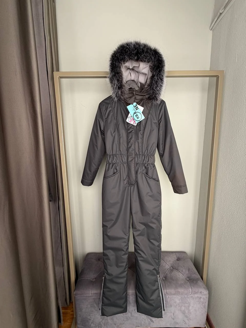 Комбинезон зимний женский Серый, подклад, молнии, манжеты: серый, Мех стандарт песец сноутоп 60*2, Молнии горнолыжные короткие, Скипас, подтяжки
